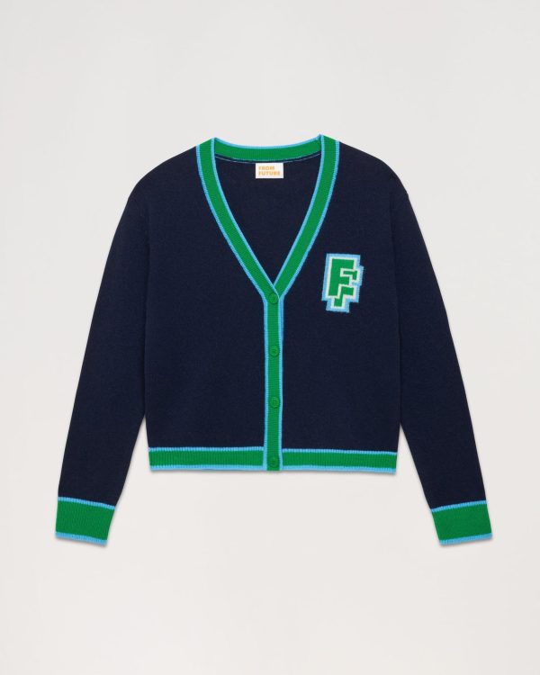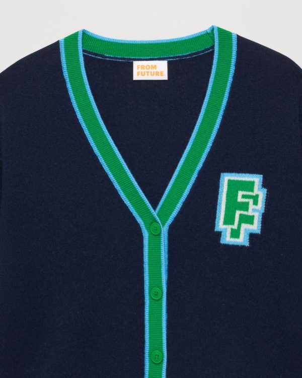 Bandes contrastées et jacquard « FF » à la poitrine : ce cardigan court esprit collège en maille 100% cachemire dévoile un col V et des manches longues.