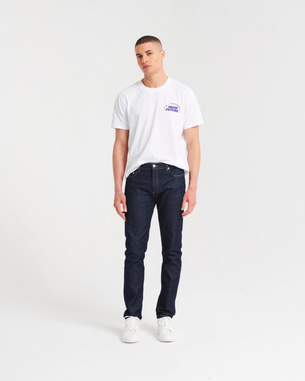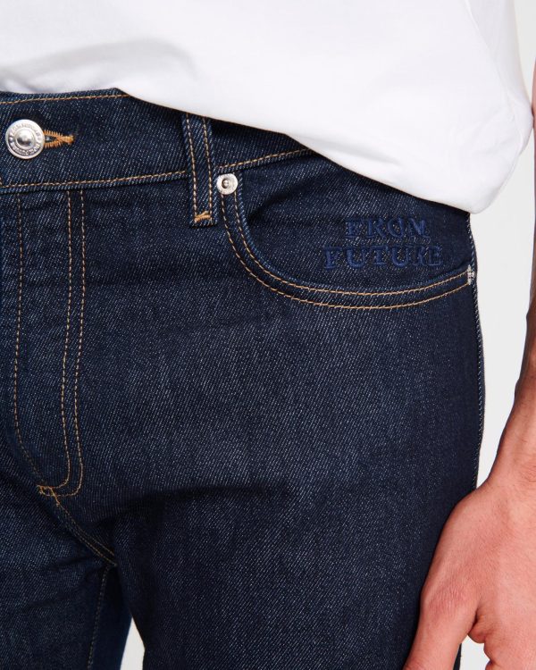 Tout savoir sur Jacob : Jean slim fit. Broderie FROM FUTURE semi-cachée au niveau de la poche gauche. Jacron coloré à l’arrière. Fermeture par boutons siglés sur le devant.