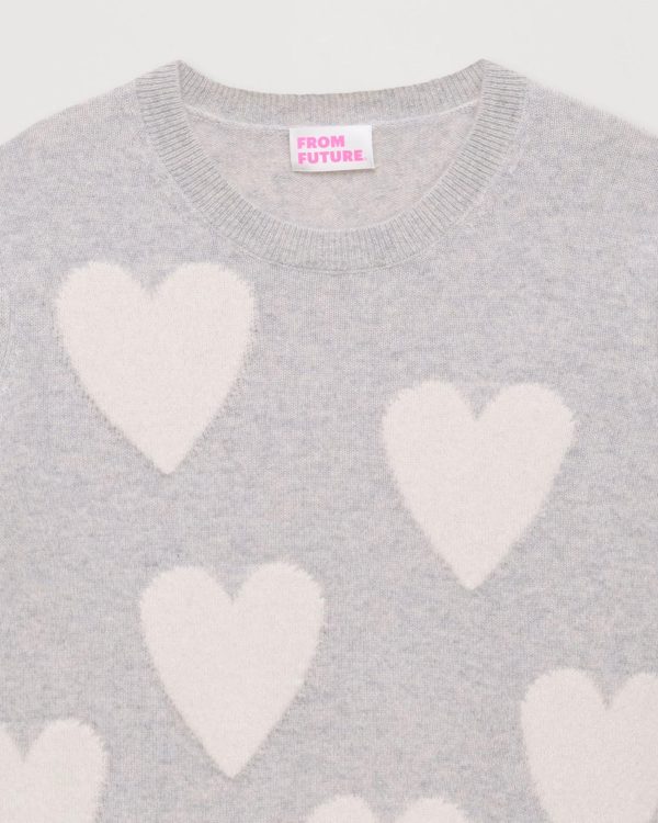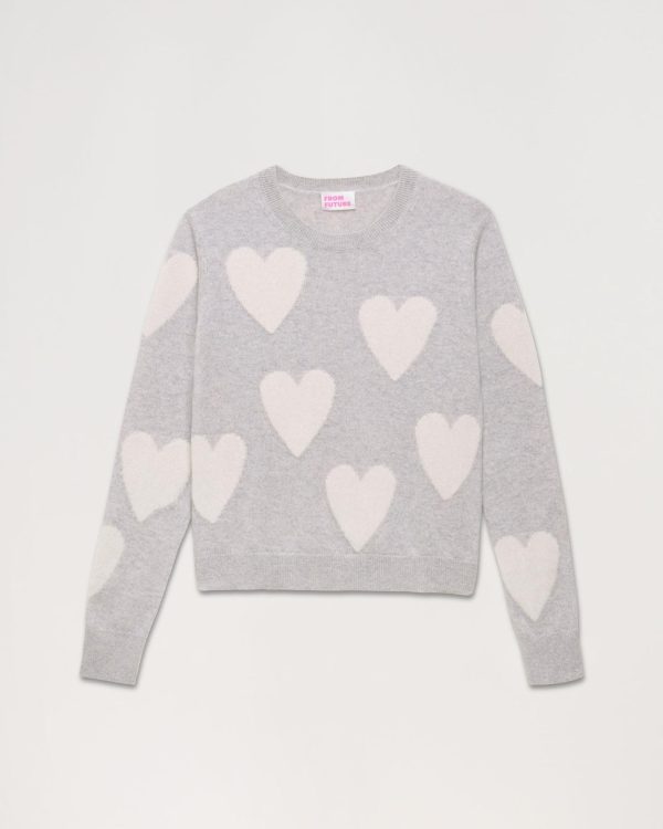 Des cœurs contrastés en all-over se dévoilent sur ce pull oversize long 100% cachemire muni d’un col rond et de manches longues.