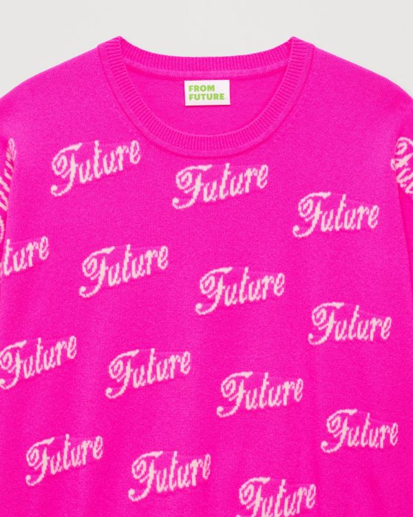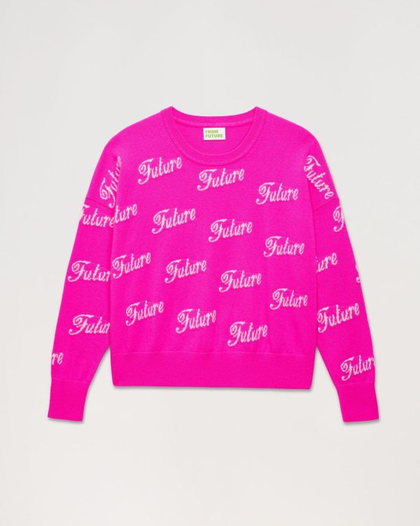 Rejoignez le club avec ce pull oversize en maille douce 100% cachemire muni d’un col rond et de manches longues, révélant un jacquard « Future » en all-over.