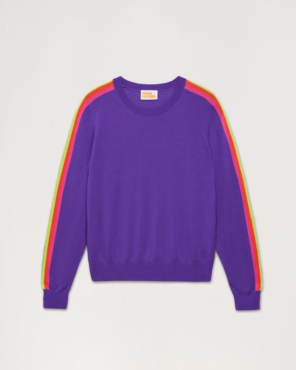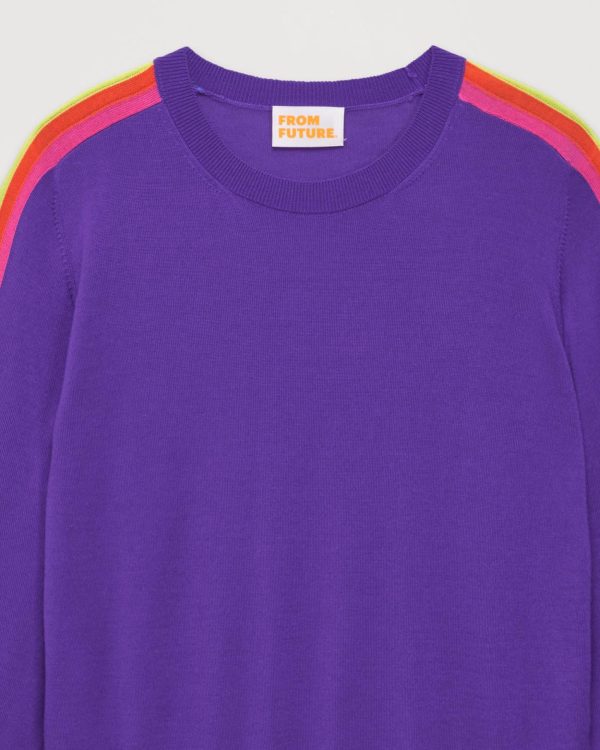 Muni d’un col rond, ce pull court en laine mérinos affiche des bandes contrastées multicolores le long des manches, signature de l’allure FROM FUTURE.