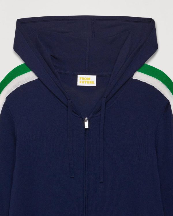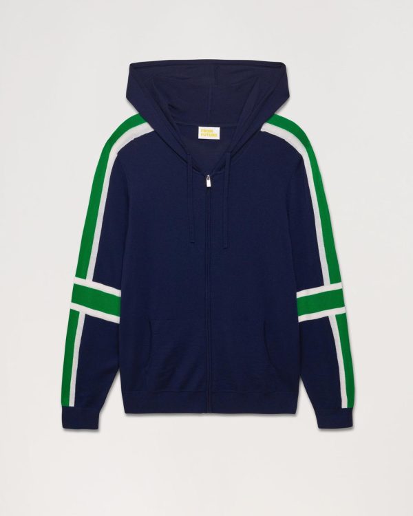 Muni d’une capuche à cordons, de manches longues et de poches, ce sweat zippé en laine mérinos douce, chaude et fine affiche des bandes graphiques contrastées.