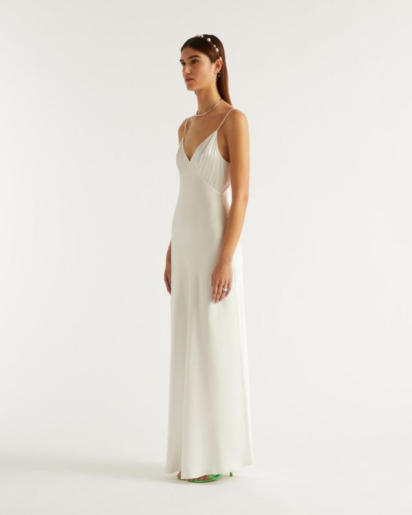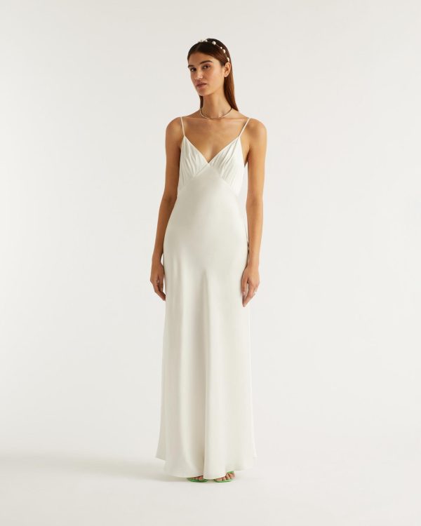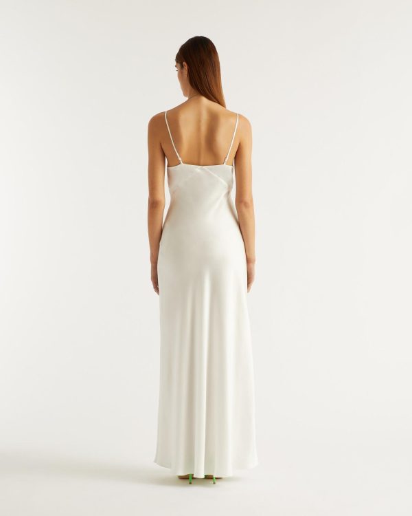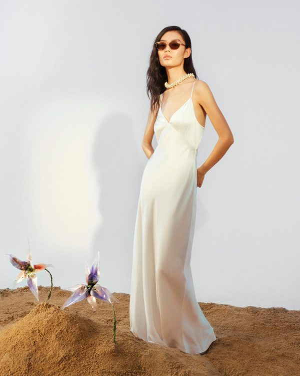 Confectionnée en satin de soie léger et soyeux, la robe longue Georgia est une incontournable du vestiaire féminin. Elle dévoile un décolleté en V, de fines bretelles et un tombé fluide.