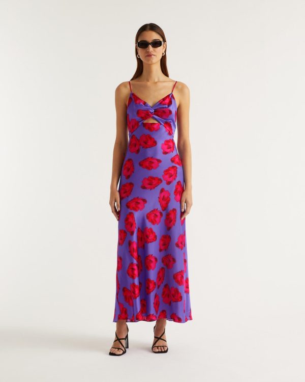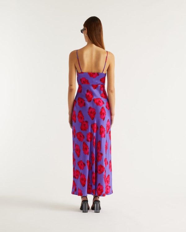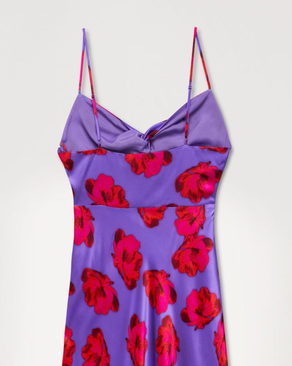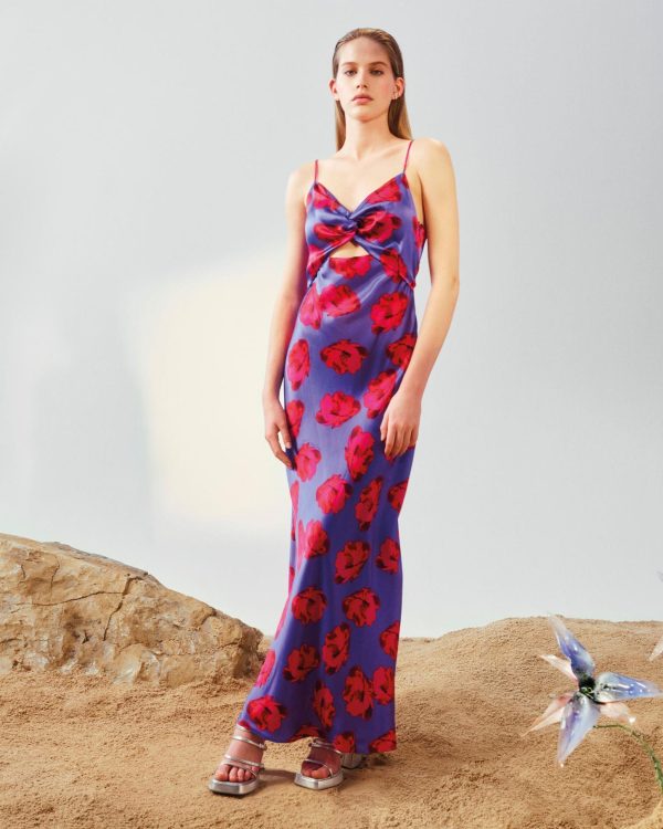 Ornée d’un imprimé fleuri, l’élégante robe longue Salma en satin de soie dévoile un décolleté noué, de fines bretelles et un tombé fluide.